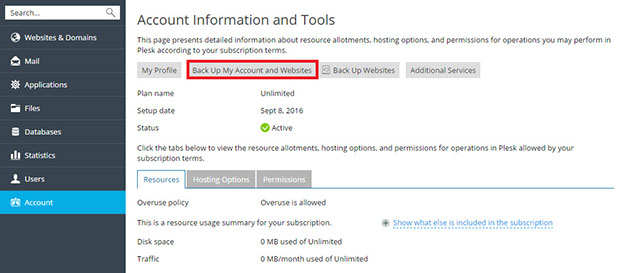 To back up data related to your account and websites, go to Account > Back Up My Account and Websites. To back up data related to websites only, select Account > Back Up Websites (Alternatively, use Websites & Domains > Backup Manager).