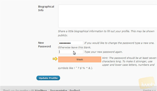 4) Re-enter the New password. The strength indicator will tell you how strong your password is, Click Update Profile to save.