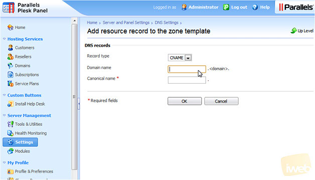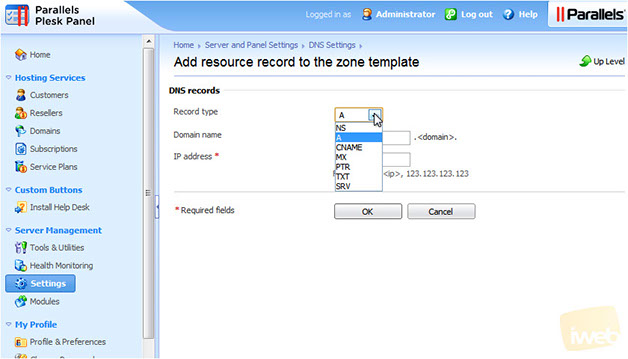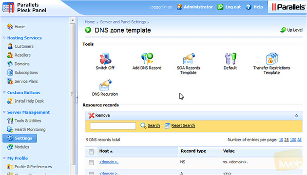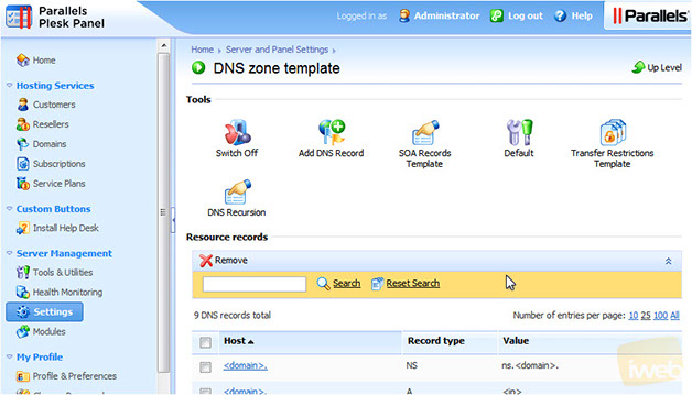 There are a number of different tools here. You can Switch Off the local DNS service for all newly created domains, Add a DNS Record to the template, and edit the SOA Records Template. You can also revert the DNS Template to the default settings, as it was originally when Plesk was first set up. Let's see how to Add a DNS Record.