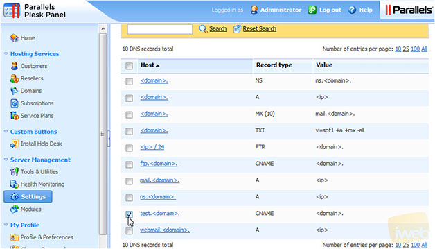 1) Whenever a new domain is added in Plesk, it uses the DNS Zone Template. You can customize this by going to Settings, then DNS Template Settings