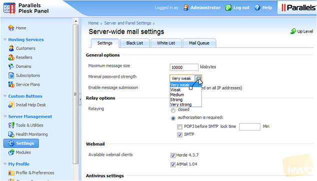 3) You can also set the minimal password strength for Mail accounts. Be careful when setting this option too high as it can result in customers being forced to choose passwords too difficult to remember.