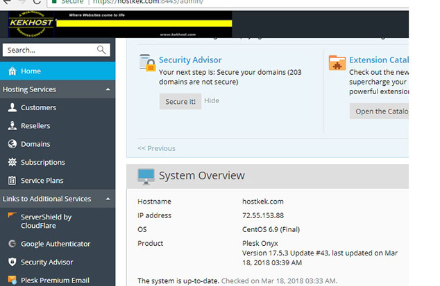 1) Log in to Plesk using URL https://server_ip:8443/.
