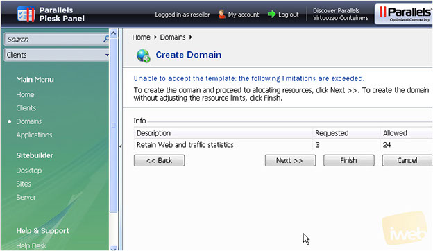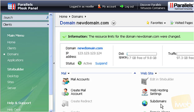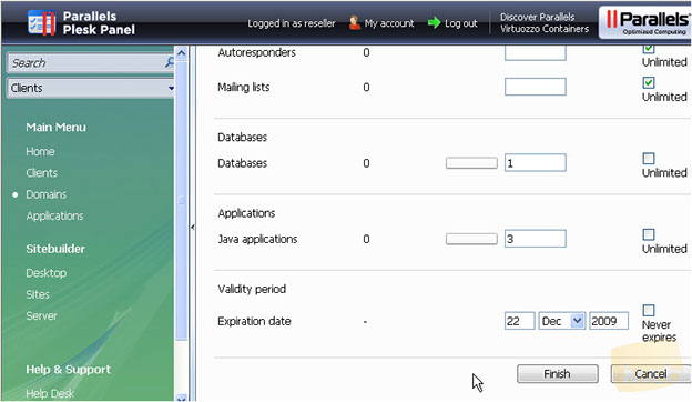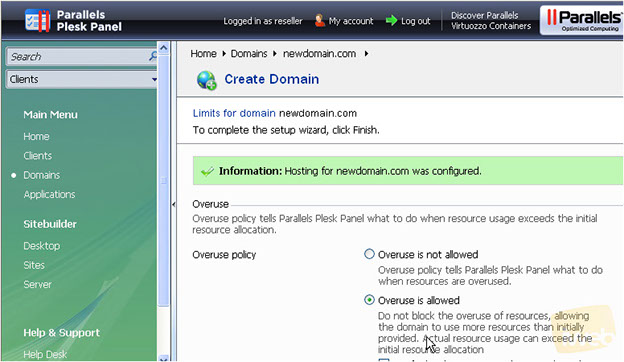 That's it! We've successfully configured hosting for the new domain. At this final step you may specify the resources' limits for this domain and finish with the setup.