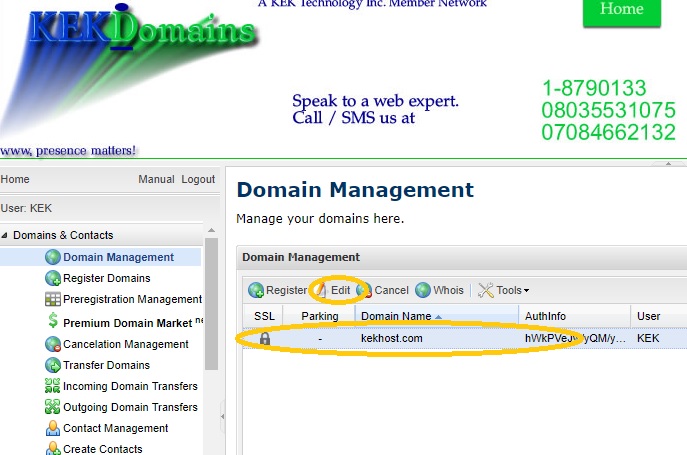 4) Select the Domain Name and Click Edit.