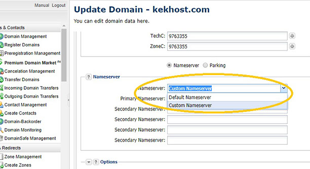 6) In the NameServer field, Click on the Down Arrow button and Select Custom Nameserver.