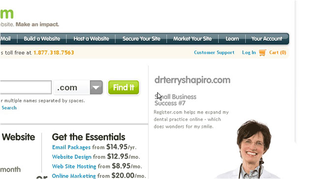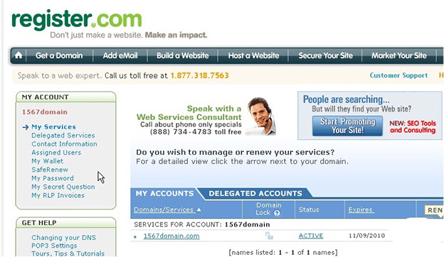 This tutorial assumes you have a domain name registered through Register.com, and starts from their home page.