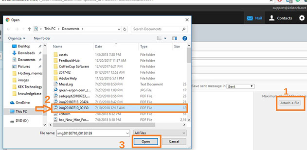 7) If you want to include one or more attachments, click "Attach A File" (1)..... then locate the file, (2) and click "Open" (3) to Upload.