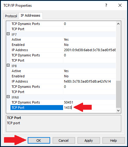 4) Double-click the TCP/IP protocol, go to the IP Addresses tab, scroll down to the IPAll section, specify the 1433 in the TCP Port field (or another port if 1433 is used by another MSSQL Server) and press the OK button: