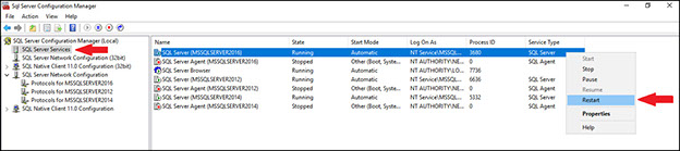 5) Go to SQL Server Configuration Manager (Local) > SQL Server Services, right-click the SQL Server (MSSQLSERVER) service and press the Restart button to apply made changes:
