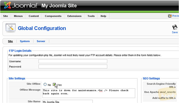 Once you are finished making your changes, simply change the Site Offline option back to Off.
