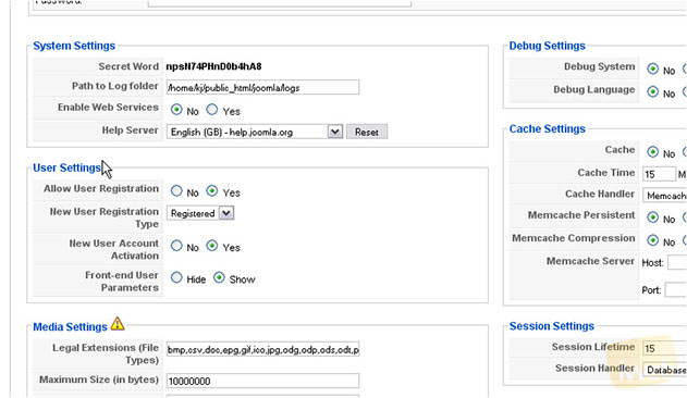 Here you can change settings related to the system, such as debugging, cache and session.
