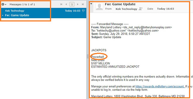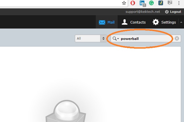 Note: RoundCube searched all messages in the Inbox for the word "powerball" and found a match as displayed below.