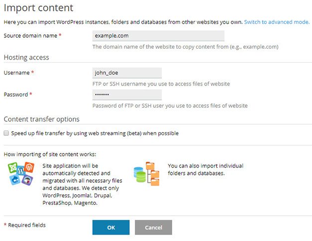 By default, website import is performed in simple mode. In simple mode, you only need to specify the source website's domain name and the username and password of the FTP or SSH user that has access to the source website's files. Plesk tries to automatically detect and apply optimal settings for the import.