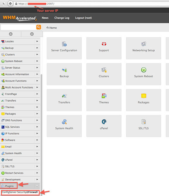 2) Configure CSF: Login to your server via WHM as root and go to the bottom left menu. In the Plugins section, go to ConfigServer Security Firewall.