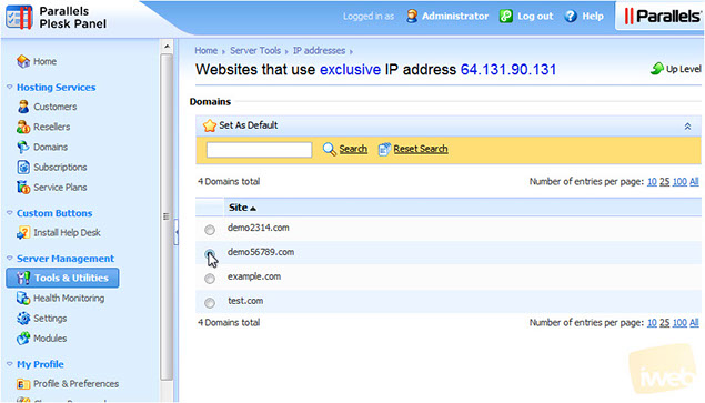 2) Here you can add IP addresses, remove them, switch them between Shared and Dedicated, and set their default SSL certificates and domains. If you're running Plesk on a VPS, many of the IP management features will be disabled. This is a limitation of VPSes in general. Let's change this Exclusive (or Dedicated) IP into a Shared IP. It's as simple as clicking the icon that looks like a crown.