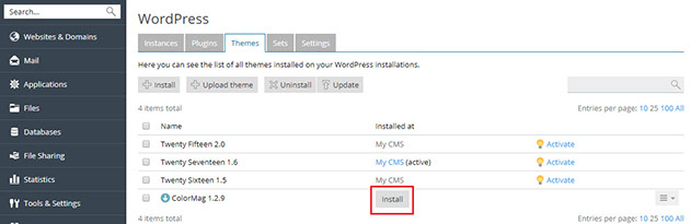 1) Go to WordPress, go to the “Themes” tab of an instance card, and then click Install.