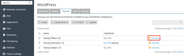 You can activate a theme installed on a particular instance or on all instances hosted on the server. A WordPress instance can have only one active theme at a time.