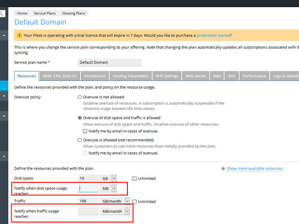 Notify me by email in cases of overuse option notifies users as soon as disk space or traffic usage exceeds the specified limit. If this limit is set to a small value, notification will be sent despite the fact actual limits are not exceeded.