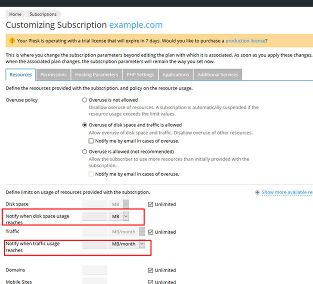 > A subscription user or Plesk administrator gets e-mail notifications that limits are exceeding despite the fact the limits are unlimited or not exceeded yet: The 'example.com' subscription, owned by user 'Customer Name', is approaching or already exceeded the resource usage limits:
