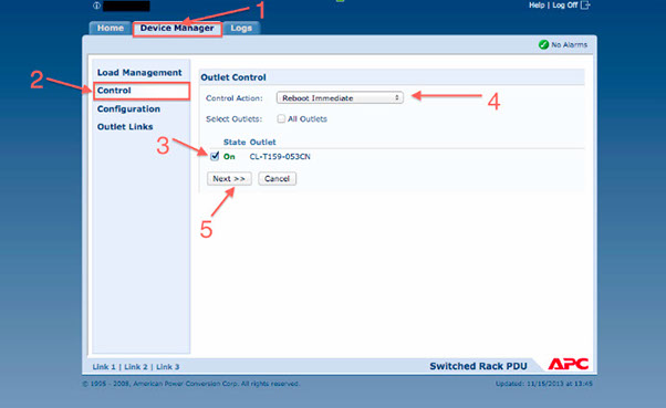 Log into your remote APC interface. The link, user name and password can be found in the welcome letter received when you first purchased your server.