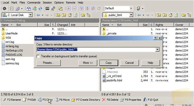 4) Now let's download file mrteng.log from the remote server to our local computer. Select the file here. Then click Copy.